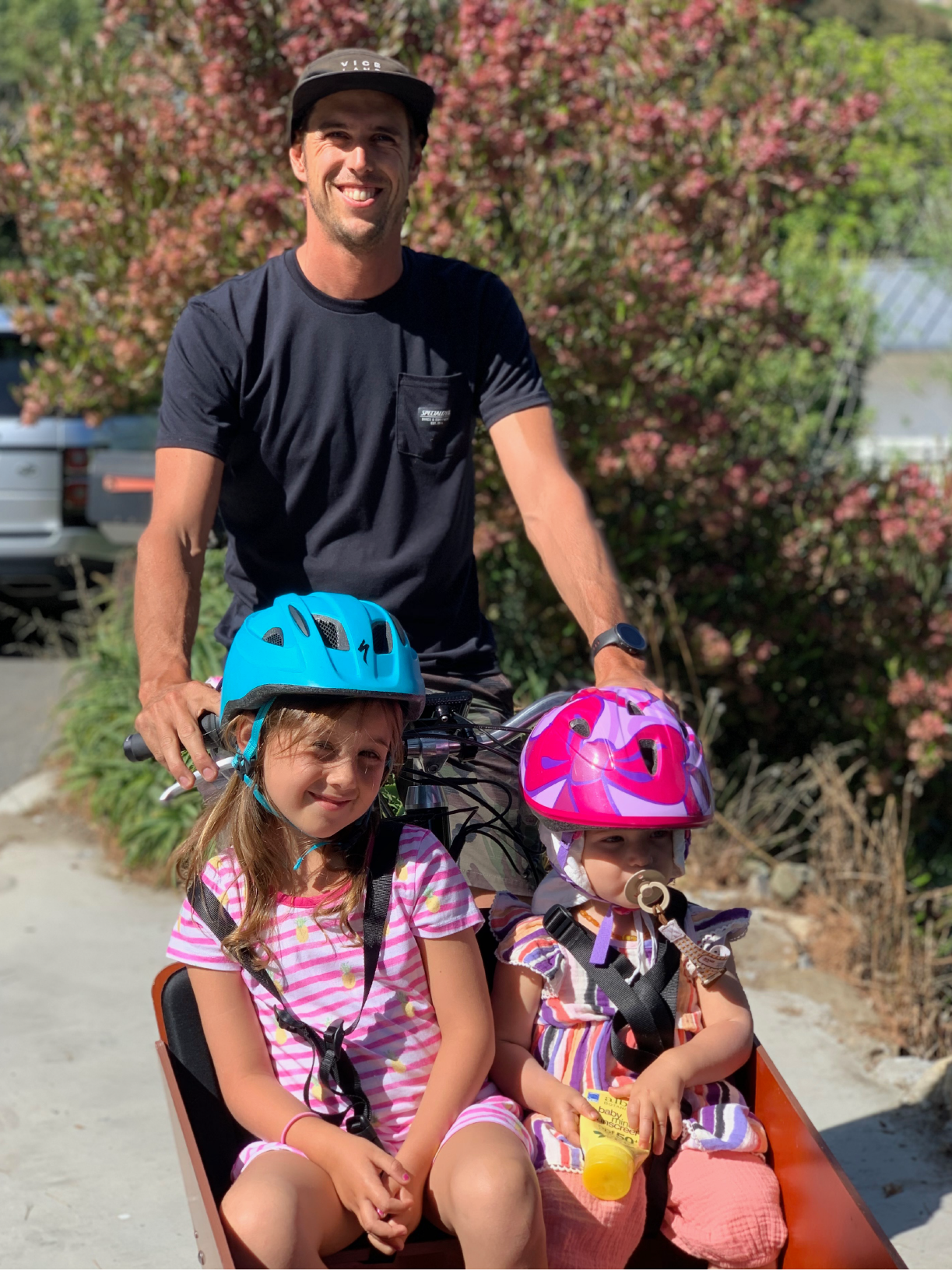 Every day, Dorian uses his cargo bike to accompany his girls to school, to go shopping and to go surfing. While in other countries this may be common, in Laguna Beach, he is the only person to move around like this: "My cargo bike is my way of being different, of being myself. And it's also the best way to have fun with my girls; they love it. They like it so much that when they see me getting on the saddle, they run to me and ask 'Dad, where are you going without us?’.”