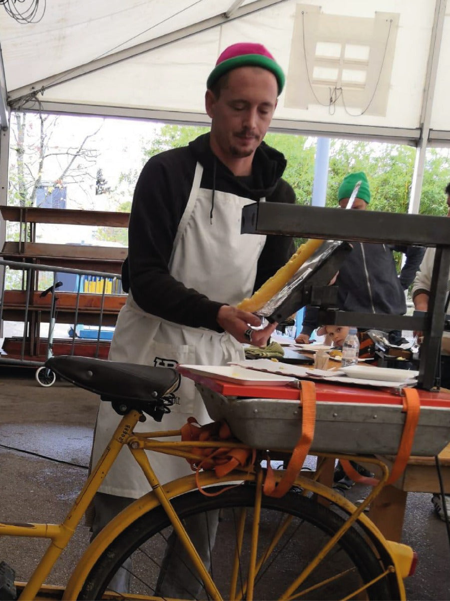 Er zijn een aantal fietsen waar Romain heel trots op is: ‘We hebben de Hand Grill, de fiets met een barbecue op de bagagedrager en een plek speciaal voor flessen en borden. En de Racl’cyclo, een oude fiets van 18 kg met een raclette plaat achterop en een verwarmde plaat voor aardappelen voorop.’